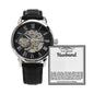 Give the gift of luxury with this handsome and daring timepiece. The Men's Openwork Watch is the perfect blend of classic design and modern styling, making it an essential accessory for your remarkable style. This watch sports a genuine leather strap, is splash resistant, and has increased durability thanks to hardened mineral glass. Our unique skeleton dial feature allows you to peer directly into the inner workings of your watch. Beautifully crafted to be automatic, this watch requires motion instead of batteries. You will keep precise time simply by wearing it, no winding necessary. This magnificent piece makes the perfect gift for yourself or any man in your life looking to add a tasteful element into his wardrobe.