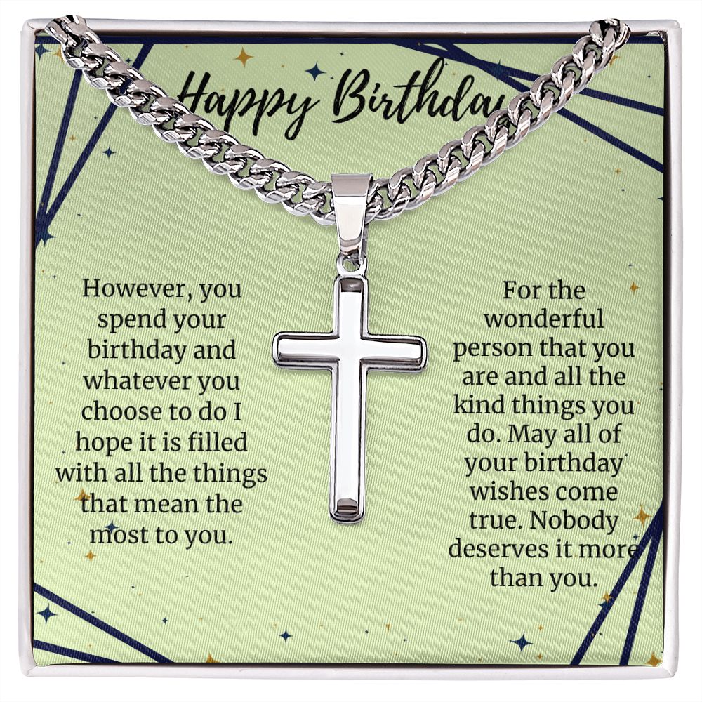 However, you spend your birthday and whatever you choose to do I hope it is filled with all the things that mean the most to you.For the wonderful person that you are and all the kind things you do. May all of your birthday wishes come true. Nobody deserves it more than you.